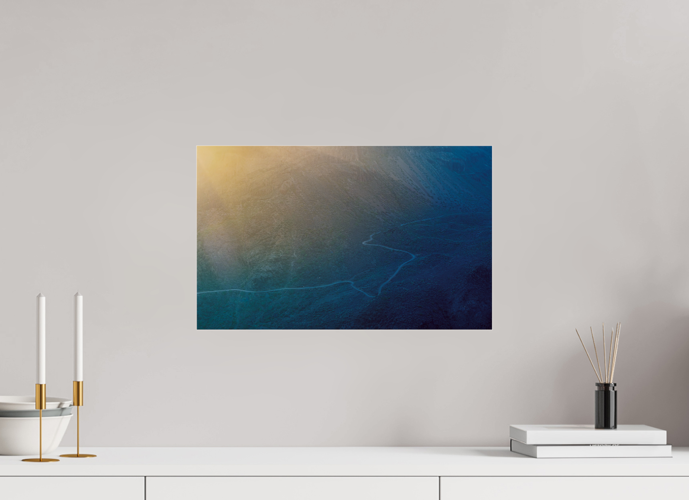 This impressive fine art motif depicts the spectacular Barranco de Fataga , one of Gran Canaria's most fascinating gorges. The winding road winds through the rugged, almost surreal landscape, inviting you to immerse yourself in the island's wilderness. The warm sunlight at the top of the image hits the cool, rugged landscape, creating a captivating color composition of gold and blue tones. This blend lends the motif a special depth and atmosphere—perfect for anyone who wants to bring the magic of the Canary Islands into their home.