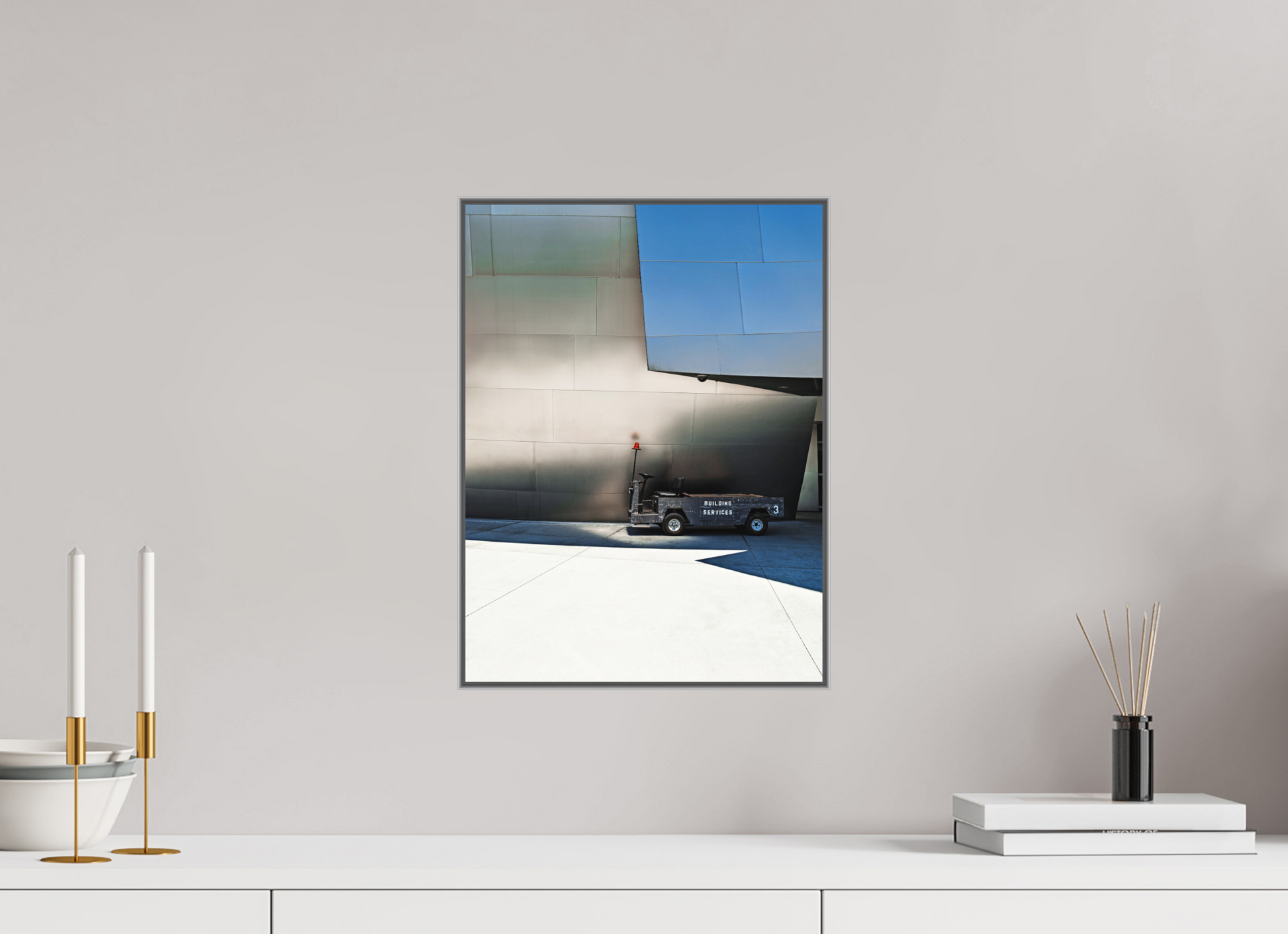 A small, inconspicuous vehicle in front of a monumental, futuristic facade—this image plays with scale, contrast, and minimalist aesthetics. The modern metal architecture of the Walt Disney Concert Hall in Los Angeles reflects the light onto its smooth surfaces, while the rough and worn "Building Services" vehicle provides a surprising contrast.