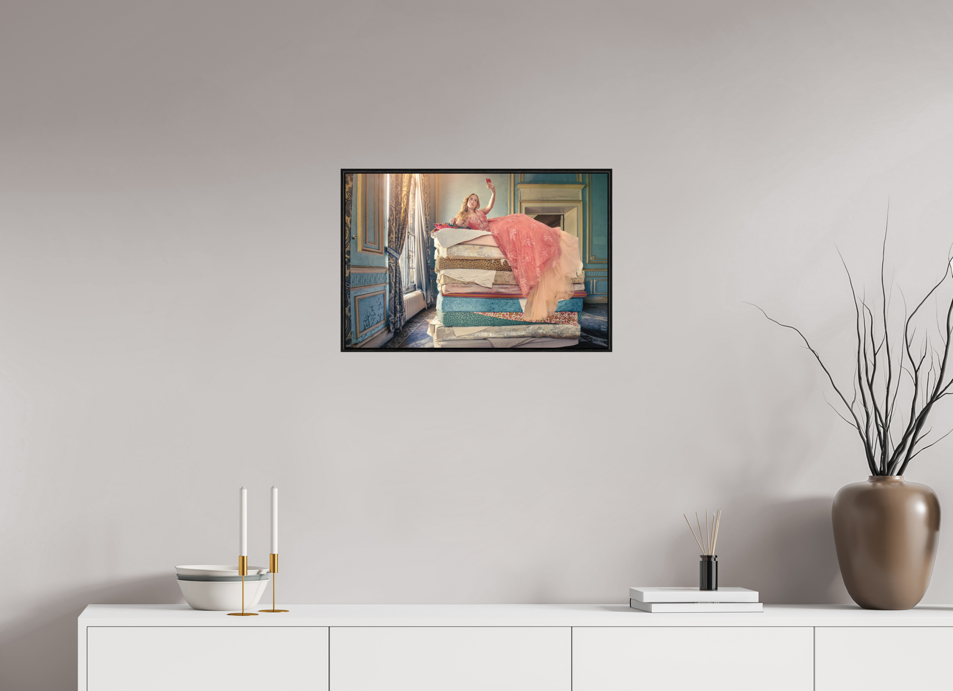 Märchenhaft und doch voll im Jetzt: Diese moderne Interpretation der “Prinzessin auf der Erbse” kombiniert barocke Opulenz mit ironischer Selbstinszenierung. Die junge Frau in ihrem aufwendig bestickten Kleid liegt auf einem Turm aus Matratzen und Decken – Smartphone in der Hand, bereit für das perfekte Selfie.
