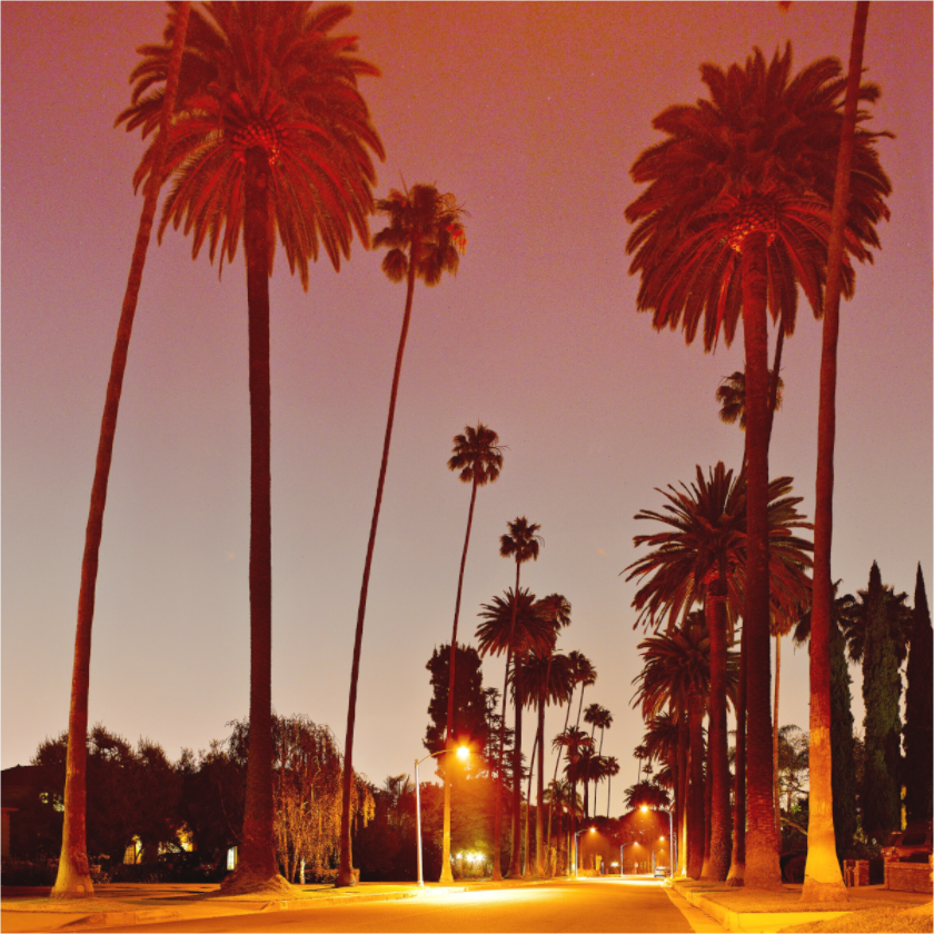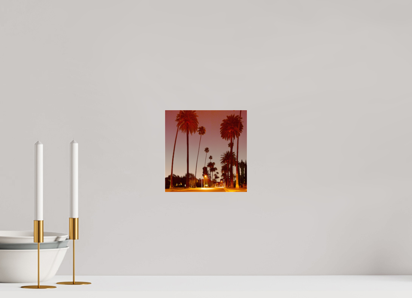 An atmospheric night shot of an iconic Beverly Hills street. The towering palm trees, illuminated by warm streetlight, create an almost surreal atmosphere reminiscent of classic Los Angeles films. This fine art print perfectly captures the timeless glamour and tranquility of the metropolis—a must-have for lovers of urban aesthetics and Californian flair.
