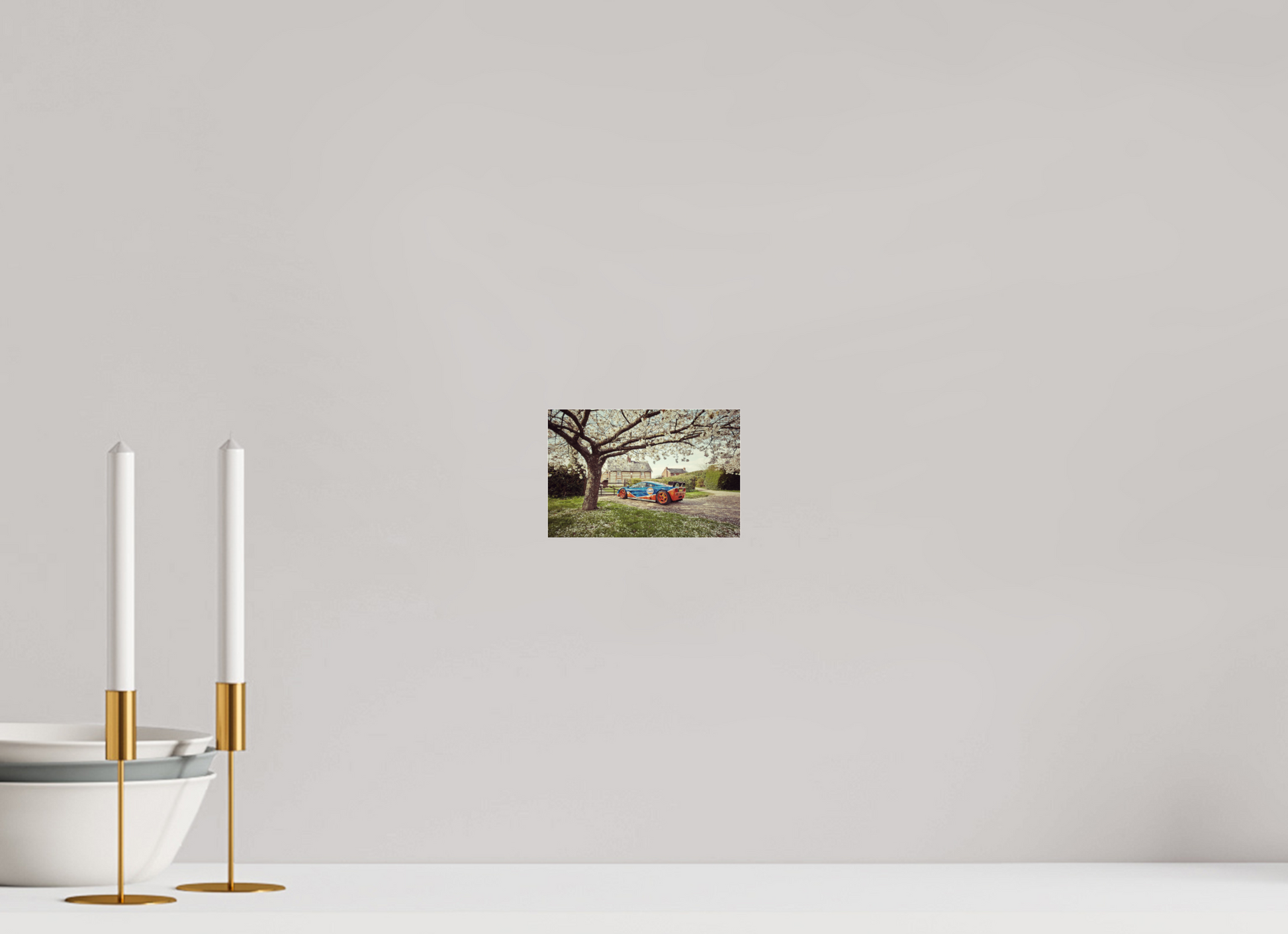 Der McLaren F1 GTR im Gulf-Design wirkt fast surreal in dieser idyllischen Szenerie. Die Kombination aus der ikonischen Rennsportlegende und der blühenden Kirschblüte vor einem traditionellen englischen Cottage verleiht dem Bild eine außergewöhnliche Dynamik.