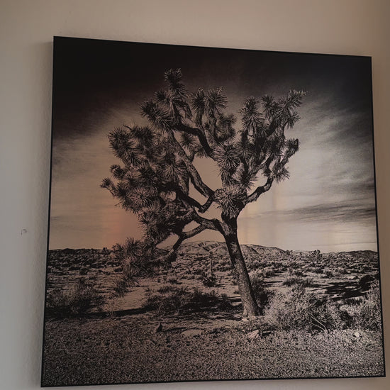 A symbol of untouched nature and the rugged beauty of the American West: This striking black and white image depicts a striking Joshua tree amidst the endless desert landscape. The subtle contrasts and dramatic lighting lend the image a timeless depth and special intensity.