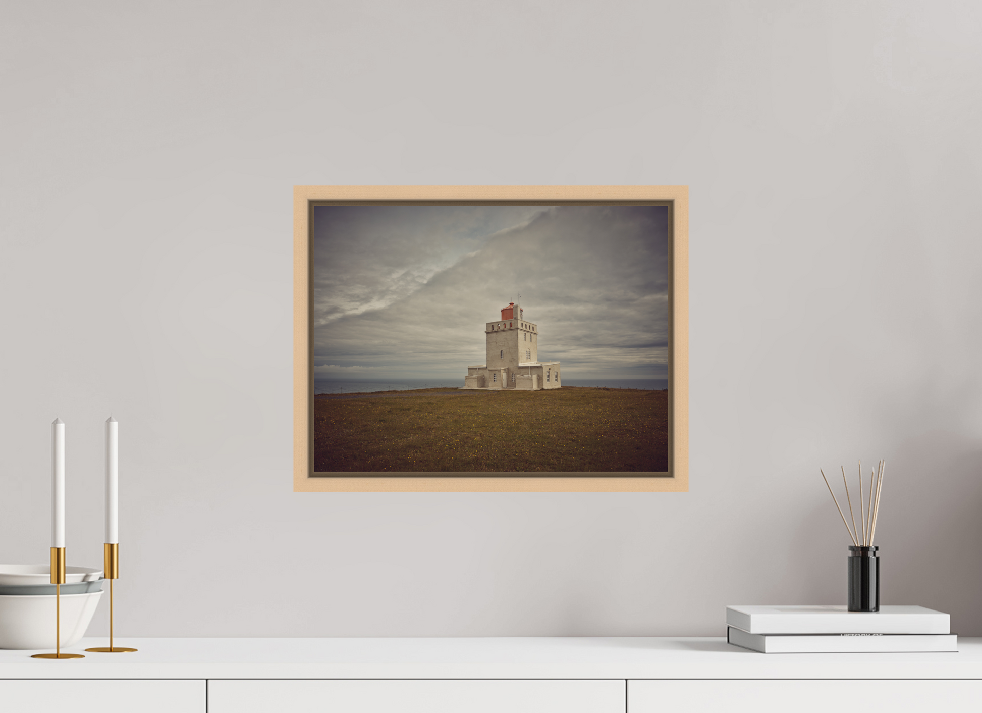 Das sanfte Licht des Nordens taucht das raue Grasland und die pastellfarbenen Mauern in eine melancholische Stimmung, während das Meer im Hintergrund nur andeutungsweise sichtbar ist.