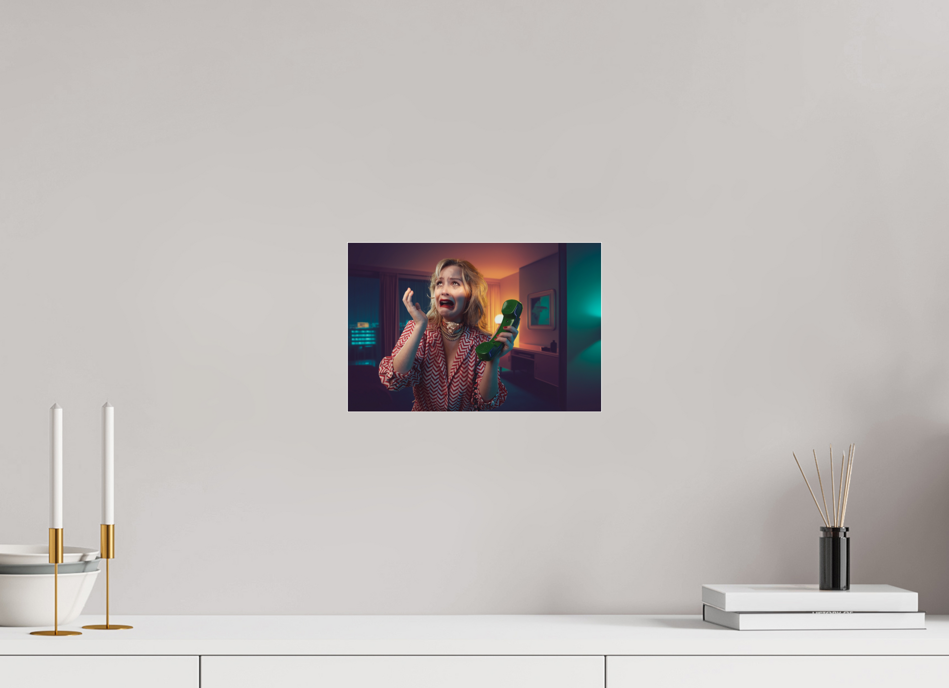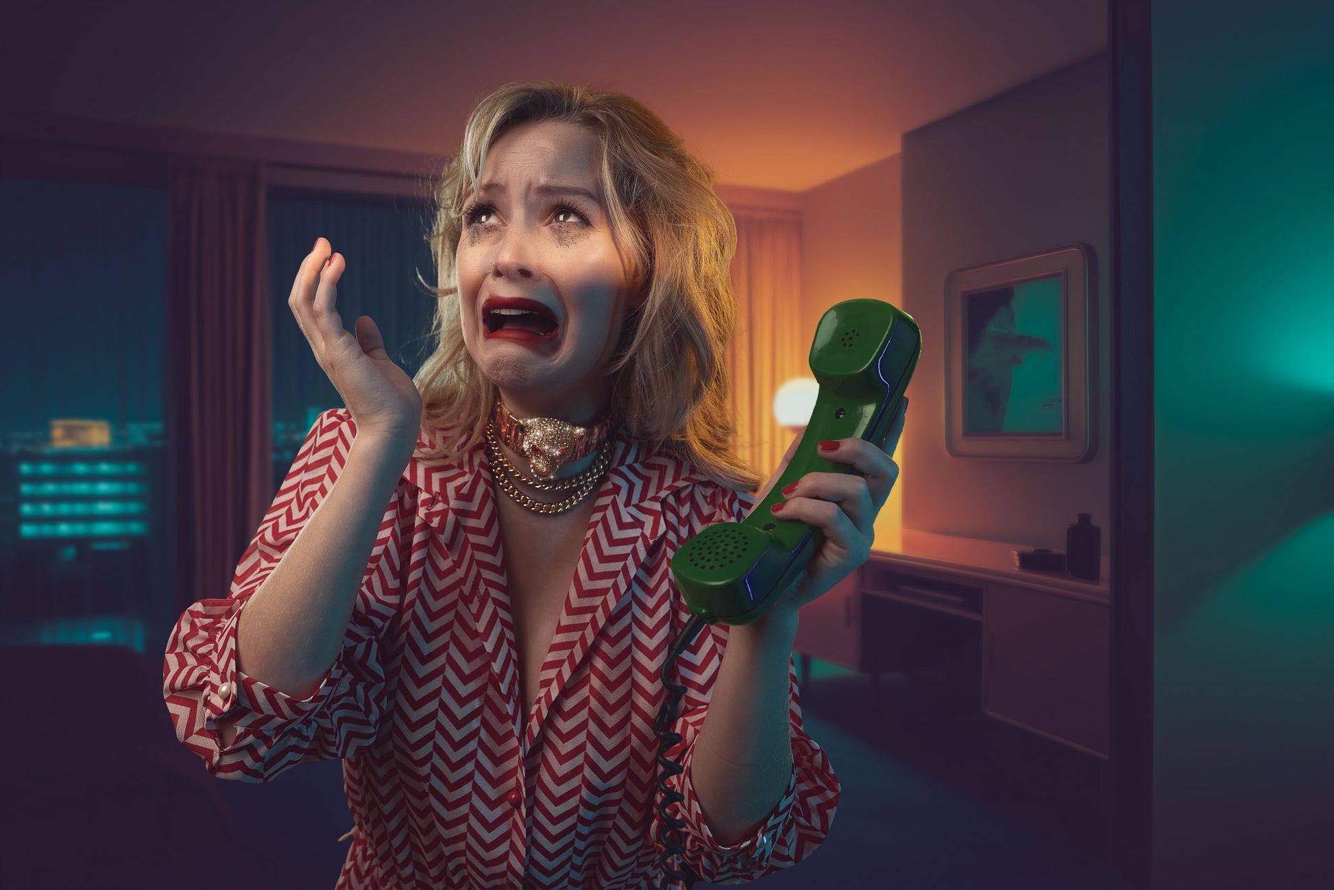 Eine Frau im 70er-Jahre-inspirierten Zickzack-Dress hält einen grünen Telefonhörer in der Hand – panisch, aufgelöst, herzzerreißend dramatisch. Ihre Wimperntusche verläuft, der Ausdruck ein Mix aus Verzweiflung, Hysterie und Kino-Überzeichnung. Der Hintergrund: ein Hotelzimmer zwischen Retro-Romantik und David-Lynch-Vibes – in mystisch-leuchtenden Farben zwischen Türkis und Orange getaucht.