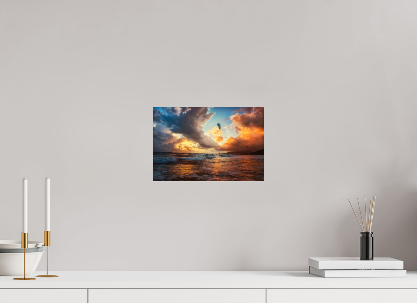 Dramatic natural force meets athletic freedom – This image captures the magic of the Andalusian coast in Tarifa , as an approaching storm dominates the backdrop. The dynamic cloud formations and the golden light of the sunset are reflected in the choppy sea, while kitesurfers harness the power of the wind. A fascinating interplay of nature, weather, and human adventure – captured in a stunning fine art print.