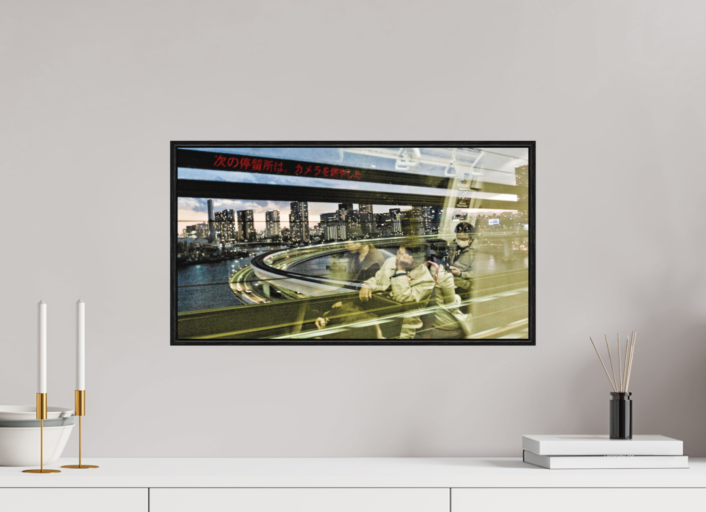 This unique image captures the mood of a subway ride across Tokyo's Rainbow Bridge. The reflection of the interior in the windows blends with the nighttime skyline and the curved roadway of the bridge. The passengers appear lost in thought, tired after a long day at work, while outside, urban life continues to move. The composition creates a layered, almost dreamlike atmosphere—a symbol of the pace and isolation of the modern metropolis.