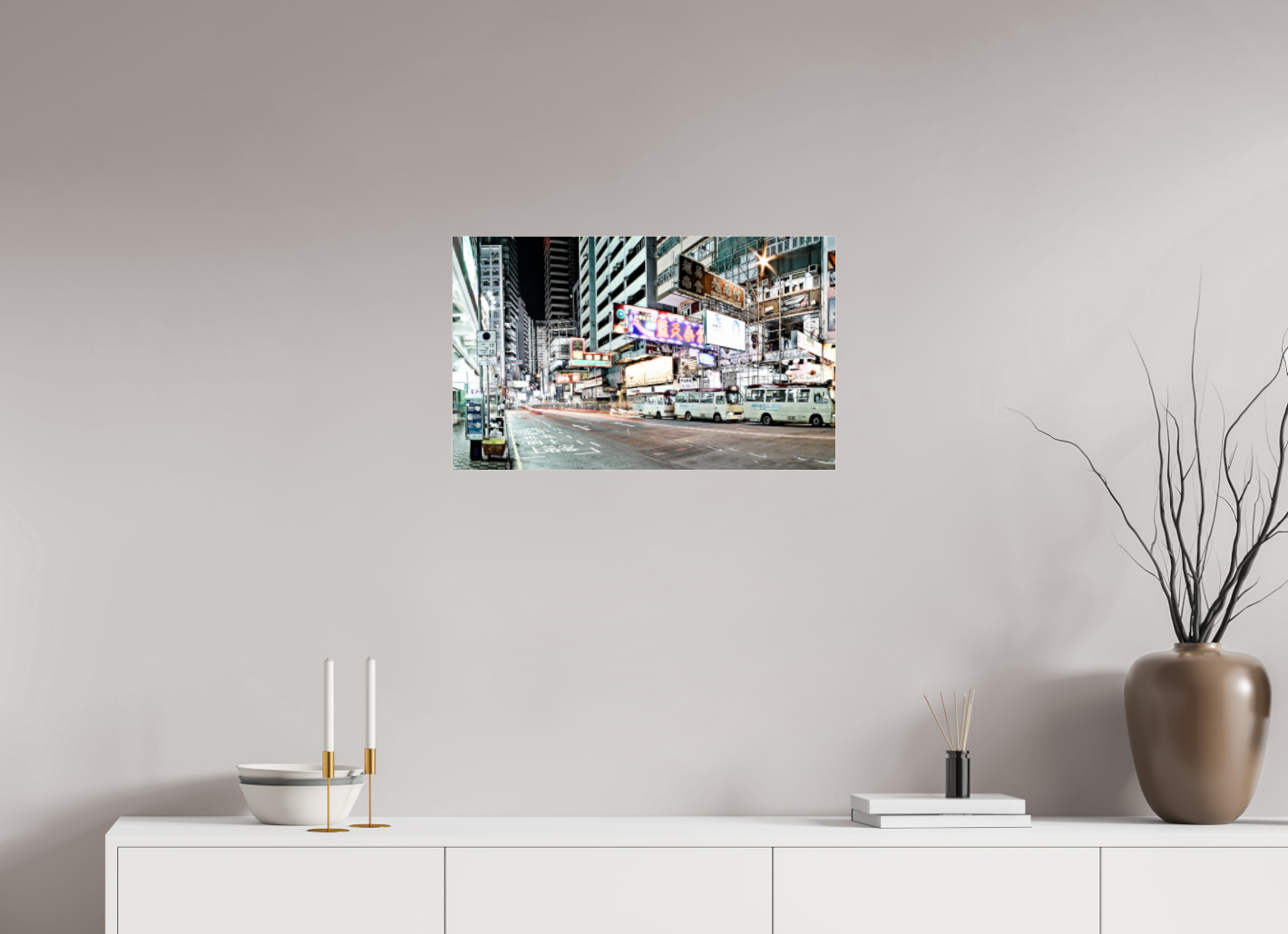 Neon lights, narrow streets, and dense high-rise facades – this nighttime cityscape from Hong Kong showcases the metropolis's unique architecture and lighting. The illuminated billboards reflect off the streets, while parked minibuses await the next day. The scene appears simultaneously urban and almost surreal, as if the city were frozen in time for a moment.